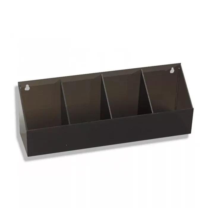 Plexiglass container featuring four compartments (to hold 3 cuffs and palm aneroid, or 4 cuffs) Measures 14" long, 3 1/4" deepCounter top or wall mountMay be used with any brand of sphygmomanometerComplete with all mounting hardware