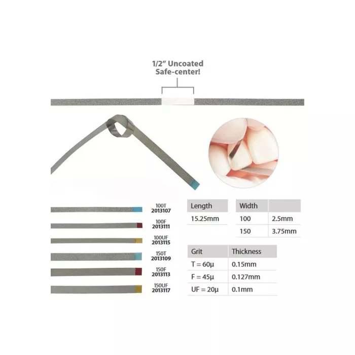 Compo-Strip diamond discs are thin, flexible, one-sided diamond abrasive strips available in two widths and three grits. They have an uncoated safe center for easy access through the contact point and are ideal for finishing Class III, IV and veneer restorations.