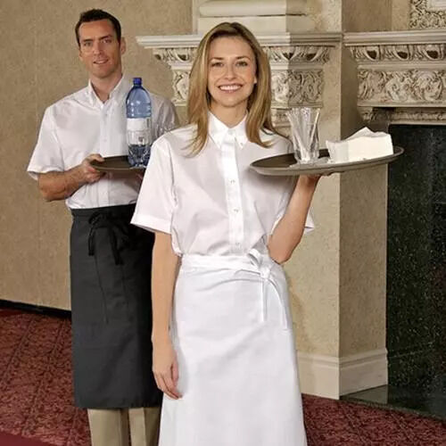 A stylish full-length multi-function apron that's a favorite of restaurant staff everywhere. It features two convenient front pockets and two strong selfties at the waist for a secure yet comfortable fit. 36" wide x 29" long. 65/35 Poly/Cotton 7.25 oz Twill Fabric.