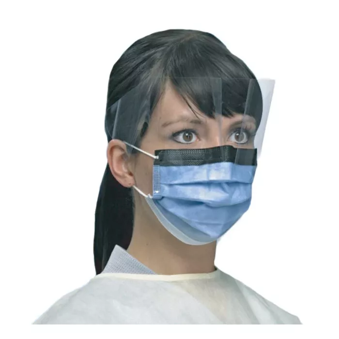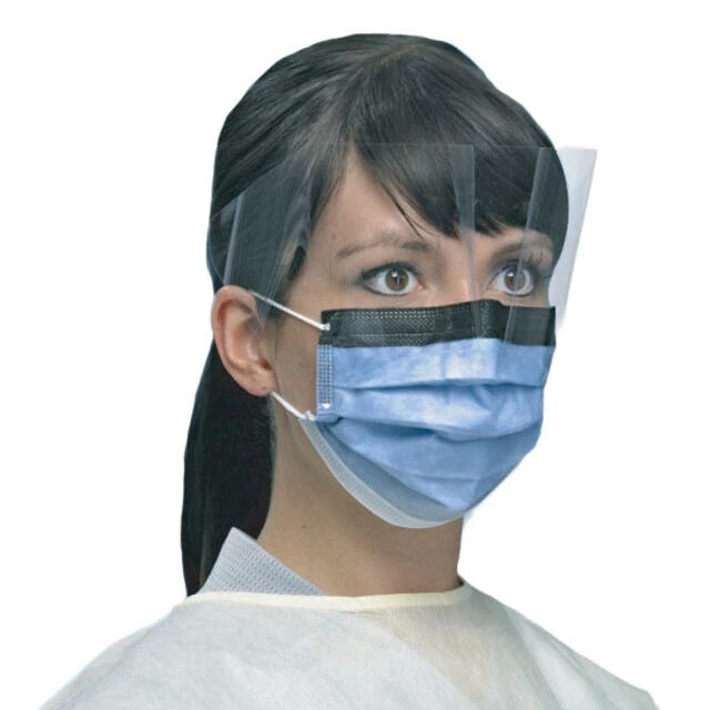 Earloop mask with visor, anti glare film, and anti fog foam.