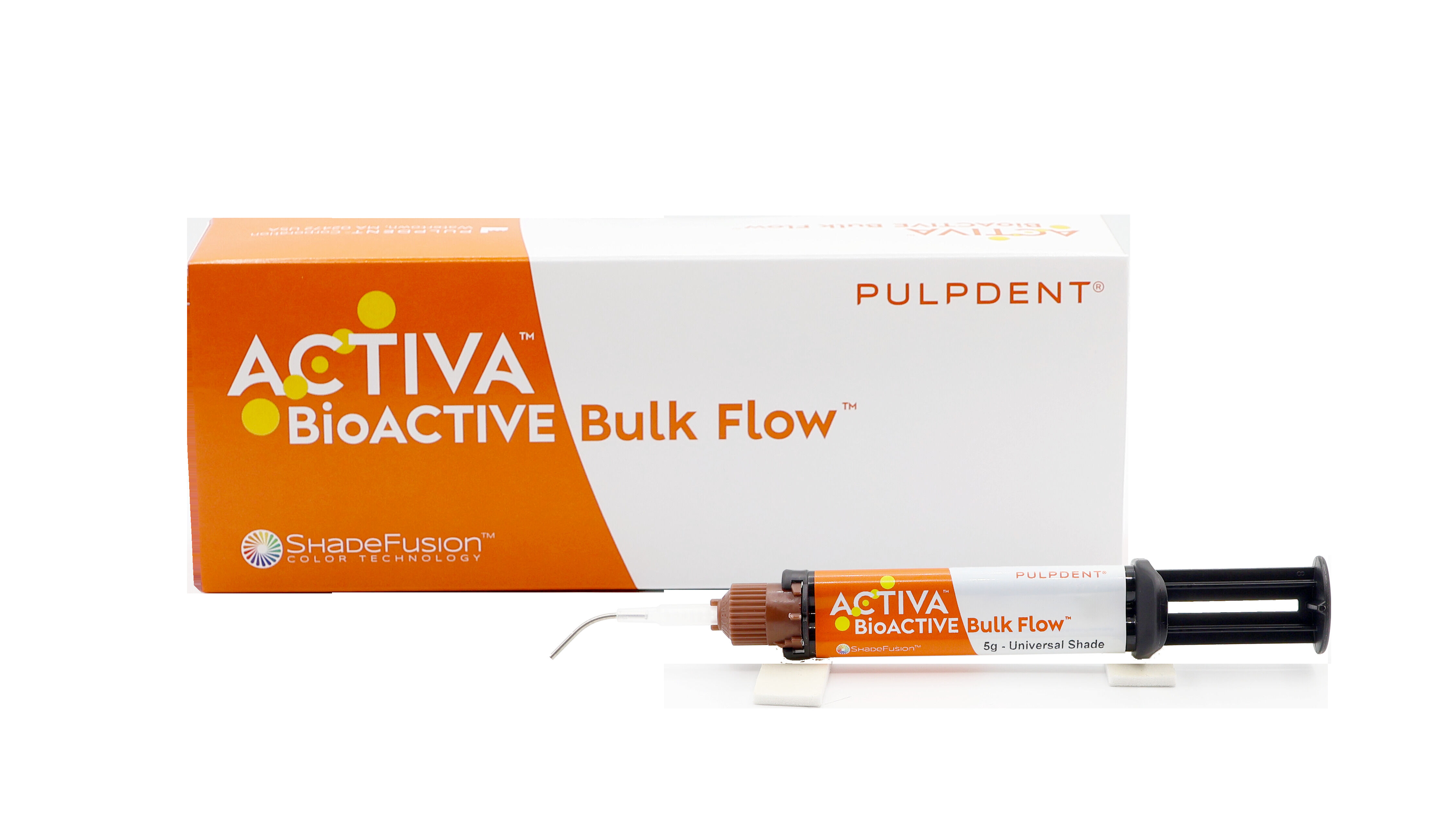 ACTIVA™ BioACTIVE Bulk Flow™ is a next-generation, self-leveling bulk-fill composite. ACTIVA BioACTIVE Bulk Flow supports the natural remineralization process and modulates biofilm to protect against microleakage and secondary caries. With low/medium viscosity and unlimited depth of cure, it is the ultimate Class I and II solution. Use as a dentin replacement or as both dentin + enamel replacement.