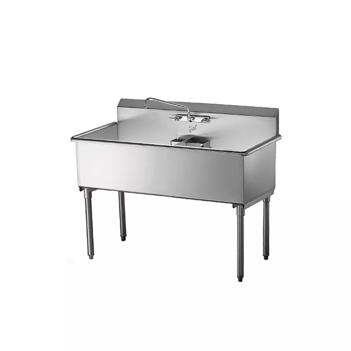 Quality construction at an affordable price. Fabricated entirely from 16 gauge T304 stainless steel. 6-1/2" backsplash, 2" thick to conceal plumbing. 1-1/2" corner wastes complete with overflow tubes. Perforated corner screens. Mounting holes for 8" wall mount faucet. 1-5/8" stainless steel tubular legs.
