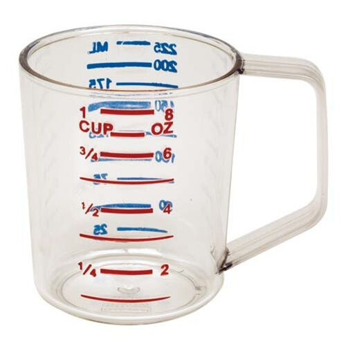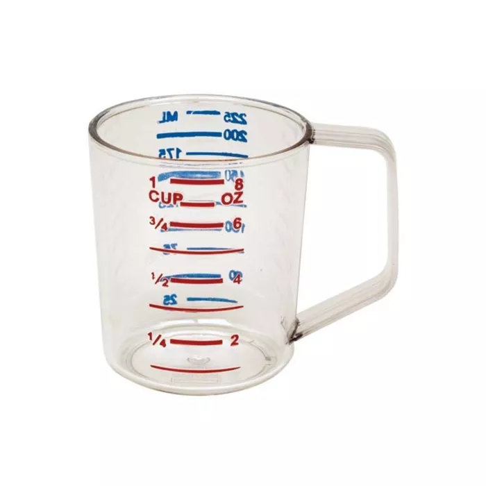 Clear measuring cups for fast, easy identification of contents. Clear, break-resistant polycarbonate. Temperature range; -40°F/-40°C to 212°F/100°C. Long-lasting measurement markings in red/blue.