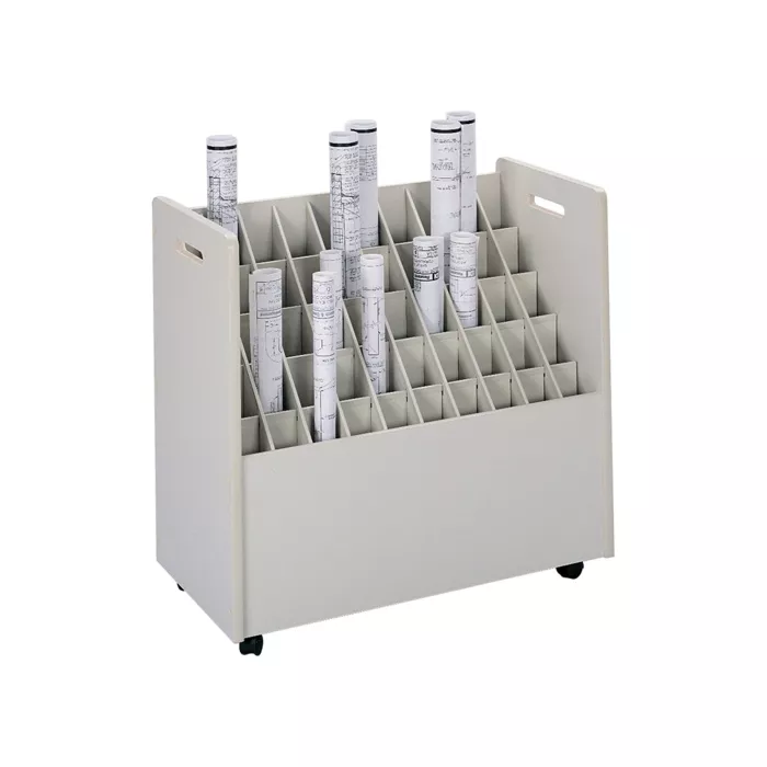 - Matériel pouvant être rangé en position verticale dans des casiers rectangulaires de fibre de carton et la conception spéciale de ces classeurs permet d'y ranger des rouleaux de différentes grandeurs
