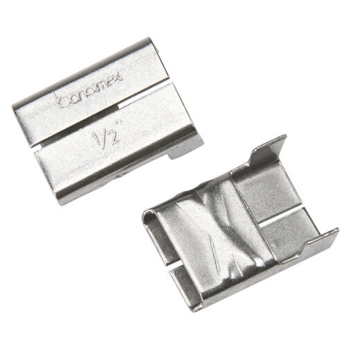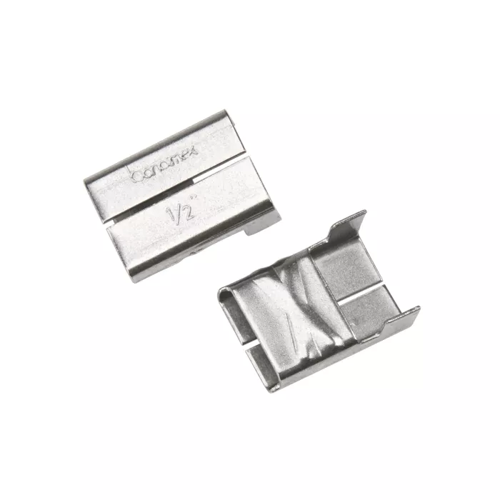 - Installé avec tendeur/couteau d'abord, puis les ailes/pattes sont martelées pour maintenir le feuillard en place