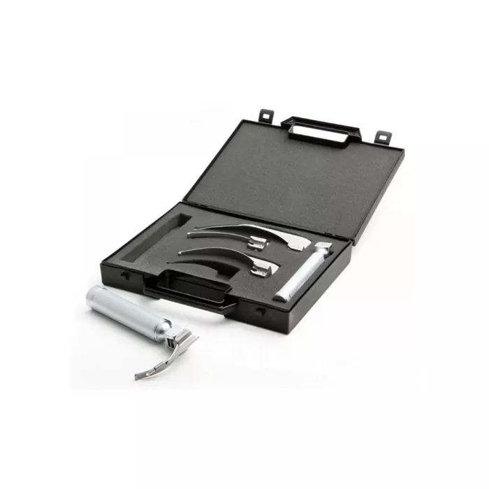 Full assortment of Standard Laryngoscope Blades and Handles in a fitted case.Satin Standard Laryngoscope Set features:Macintosh Standard set featuresFour blades (#1, 2, 3, 4) and 2 handles in foam lined fitted caseFully compatible with all major brands of laryngoscopes conforming to ASTM F965 or ISO 7376Standard Blades feature:Stainless steel construction with Satin, non-glare finishStandard Handles feature:Satin chrome-plated brass handles with a knurled finish for a positive gripAvailable in traditional and stubbyBatteries not included