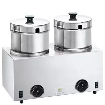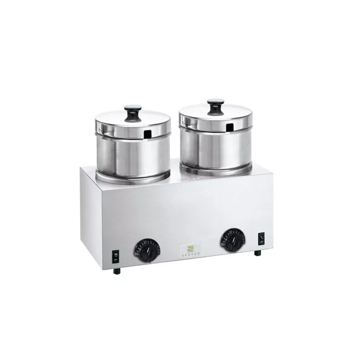 This compact, rethermalizing soup station quickly heats and keeps each 5 qt soup inset at the perfect serving temperature from the first serving to the last. Built for durability, the base is stainless steel with stainless steel water vessels, insets and hinged lids. Twin well food warmers use individual thermostatic controls to obtain accurate heating for each soup flavor. Units include stainless steel water bath, insets and hinged lids that return moisture to the food to retain flavor.