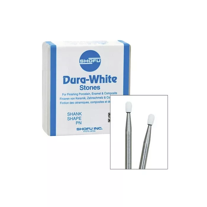 Dura-White Stones are ideal for fine contouring and finishing of enamel, composites, compomers and porcelains. - Micrograined aluminum oxide grit - Vibration-free performance - Long lasting - Use Dura-White Stones for: fine finishing on enamel, composites, glass ionomer restoratives and porcelains Shofu Dura-White Stone Chart