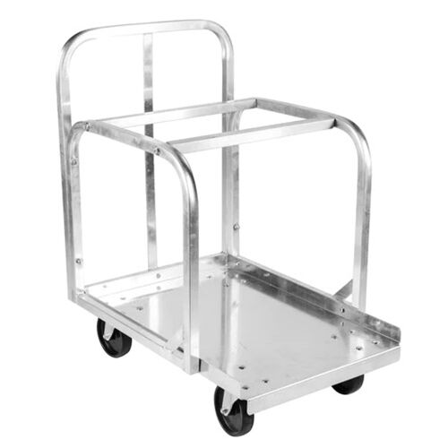 Space efficient and lightweight, this aluminum bun pan cart allows you to transport 120 full-size r 240 half-size empty pans effortlessly with its easy-to-grip handle and swivel wheels.