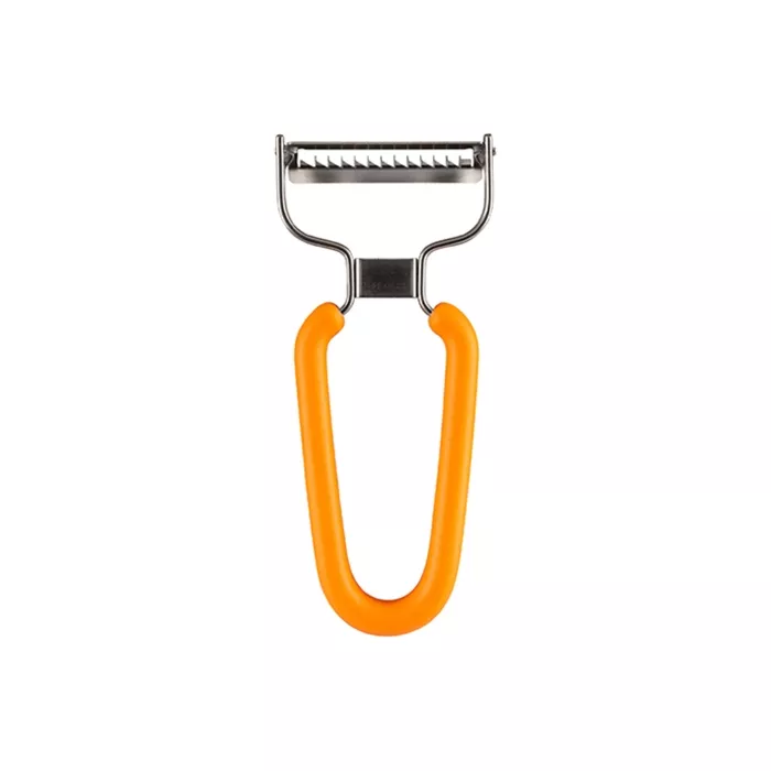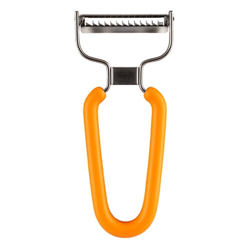 Perfect for large vegetables, this Y-shaped julienne peeler is designed to be both sturdy in it's stainless steel construction and ergonomic with its handle design. The wide blade makes easy peeling, and can be covered with the included blade protector to ensure safety and lasting sharpness.