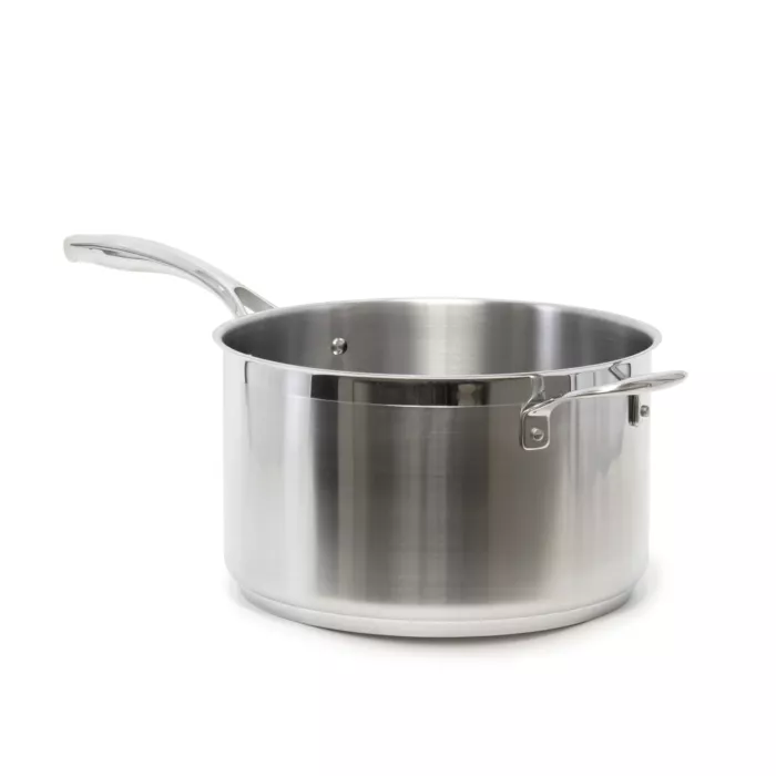 Professional 3 ply stainless steel cookware with an aluminum core for excellent heat conductivity. Designed with a heavy duty forged handle and durable stainless steel rivets to withstand the toughest kitchens.