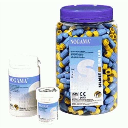 Silmet's Nogama is an admix of spherical, copper-silver eutectic particles and lathea cut conventional alloy. Nogama provides a firm pack and smooth carving. Innovative SecureCap capsules in jars of 50, 100 and 500 capsules (1,2 &3 spill). Ultrasonically welded capsules for maximum protection. Non welded capsules are also available.