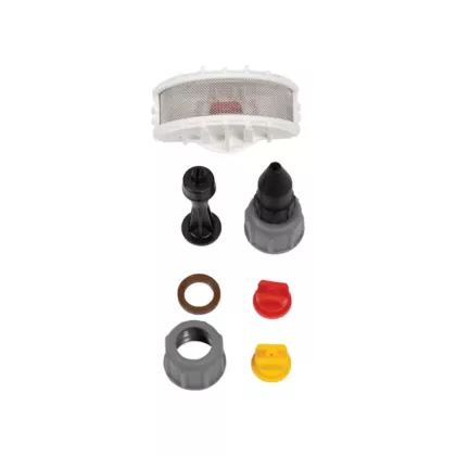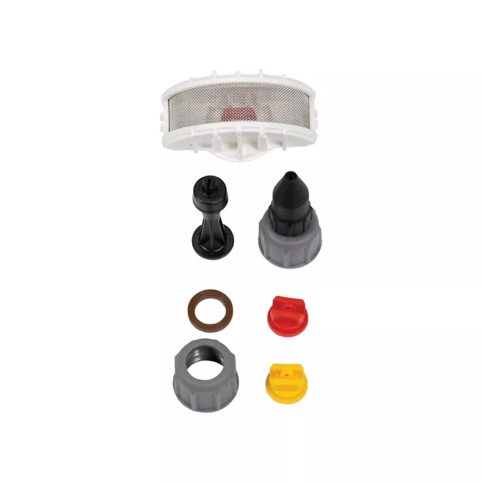 - Comprend: embout ajustable en poly (181823), écrou-capuchon en poly (181804), sceau plat Viton(MD) (181812), embout moussant à volume faible (180266), embout moussant à volume élevé (182187), pointe plate en poly rouge pour ventilateur (180097), pointe plate en poly jaune pour ventilateur (180168)