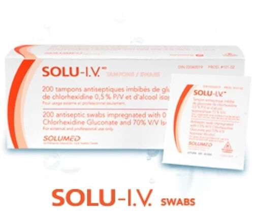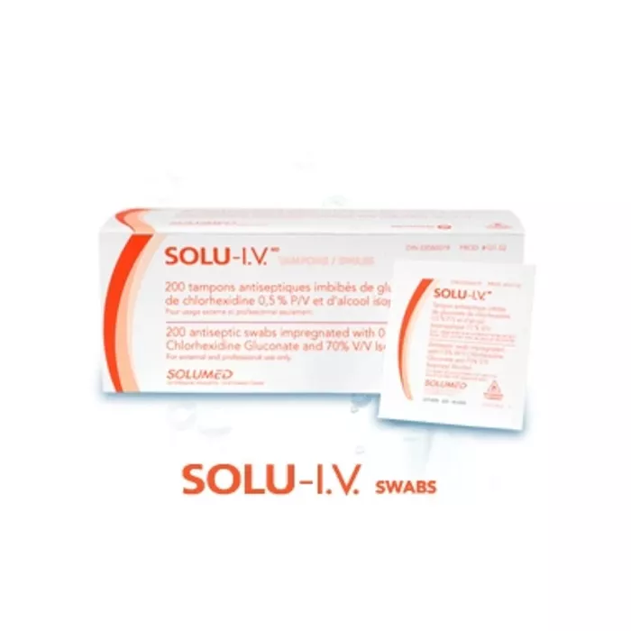 200/box Swabs impregnated with 0.5% W/V Chlorhexidine Gluconate and 70% V/V Isopropyl Alcohol Colouring-free and fragrance-free antisepticVue d’ensemble