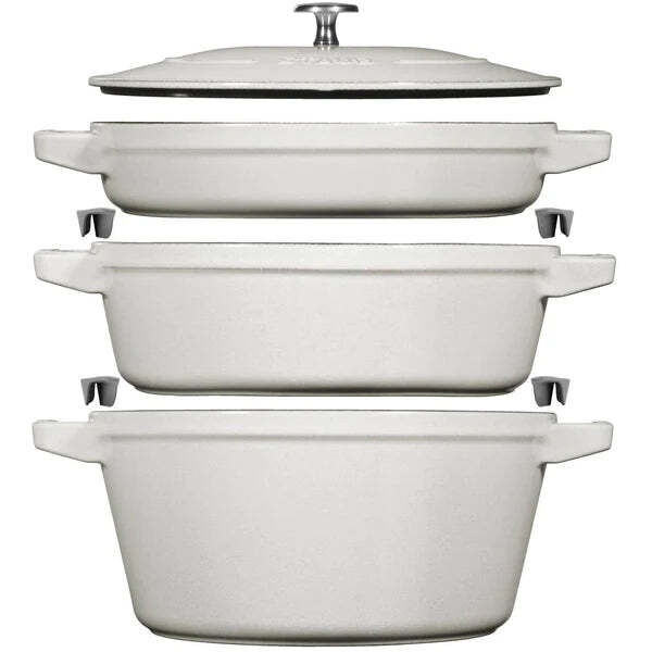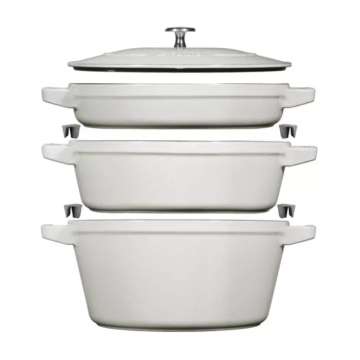 Comprehensive Set: The Staub Stackable set includes four essential pieces of cookware: a 4.2-quart/4-liter cocotte, a 3-quart/2.9-liter braiser, a 9.5-inch/24 cm skillet, and a lid that is compatible with each piece. This comprehensive collection equips you with the tools to tackle a wide range of cooking techniques and recipes.