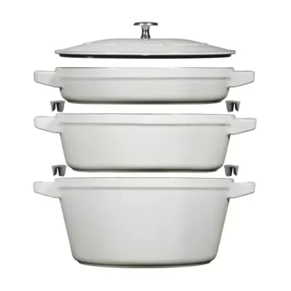 Upgrade your cooking experience with the Staub 4-Piece Cast Iron Pot Set in White Truffle, a versatile and space-saving ensemble that caters to a variety of culinary styles. This thoughtfully designed set is perfect for both professional chefs and home cooks, offering essential cookware pieces that effortlessly stack to save space in your kitchen.