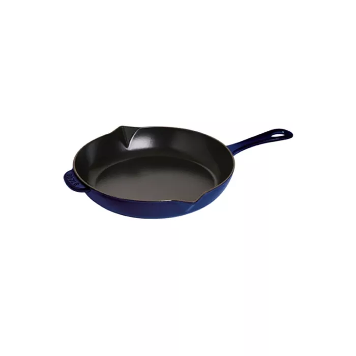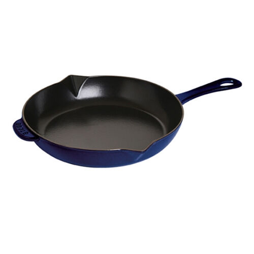 Staub Enamelled Cast Iron has the advantage of the natural heat retention and redistribution properties of cast iron. Enamelling process includes 2-3 coats, inside and out. Black matte enamel interior coating, develops non-stick properties with regular use, thus an ideal surface for braising, roasting and caramelizing. A smooth enamel coated base prevents surface scratches. Traditional and authentic French craftsmanship. Suitable for all cooktops including induction. Oven Safe up to 500°F. Made in France. Base Size: 10"/26 cm. Colour: Dark Blue.