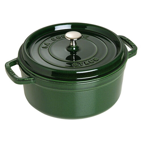 A traditional pot featuring high vertical sides in proportion to a flat base. Made of enamelled cast iron for its natural heat retention and redistribution. Due to the superior construction of the Staub cocotte lids, less humidity can escape during the cooking process. The self basting system consisting of distributed spikes over the whole inside flat lid ensures a continuous natural basting cycle for moist and nutritious meals. Enamelling process includes 2-3 coats, inside and out. Black matte enamel interior coating, creates a non-stick surface with natural use & provides the ideal surface for braising, roasting and caramelizing. Oven Safe up to 500°F. Nickel steel knob. Suitable for all cooktops including induction. Requires no seasoning. Made in France. Base Size: 10"/26 cm Round. Capacity: 5 Qt/4.6 L. Colour: Basil Green.