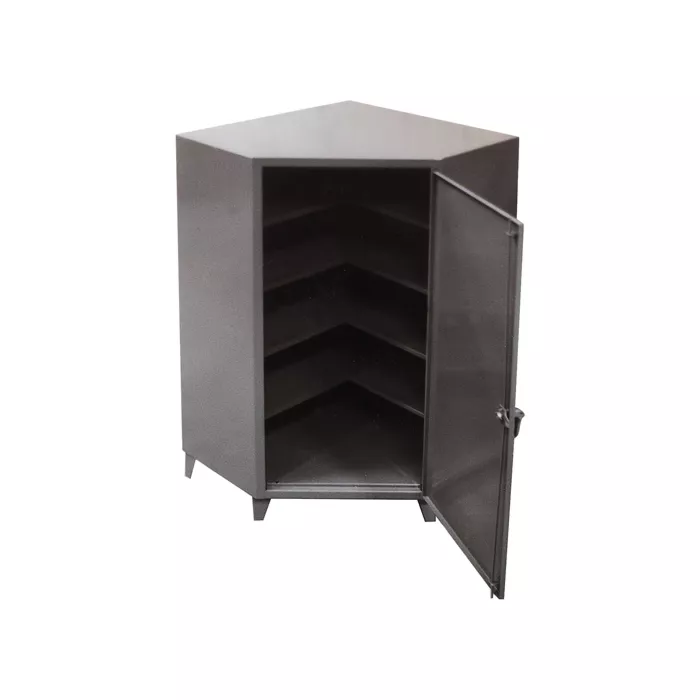 - Cette armoire de coin de calibre 12 entièrement soudée élimine le fouillis dans le coin. Rangez vos outils de forme irrégulière dans cette unité compacte équipée de quatre tablettes réglables de calibre 14 et d'un moraillon pour cadenas. La très grande porte permet l'accès aux des deux côtés des tablettes en coin.