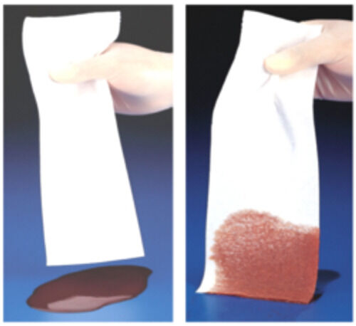 Super absorbent powder sandwiched between layers of absorbent paper fiberInstant absorption to contain spillsEssential safety tool for specimen shipping containers and specimen bagsEach 4 inch by 5 inch sheet proves 200 mL liquid capacity