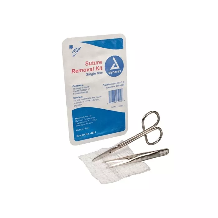 Kit complet : Inclut tous les outils nécessaires pour le retrait des sutures, comprenant généralement des ciseaux stériles, des pinces et de la gaze.
