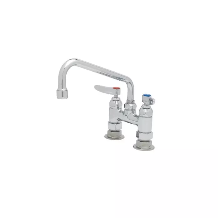 4" deck mount mixing faucet with polished chrome plated brass body, 8" swing nozzle with stream regulator outlet, compression cartridges with spring checks, lever handles, and 1/2" NPT female inlets. 17.90 GPM @ 60 psi