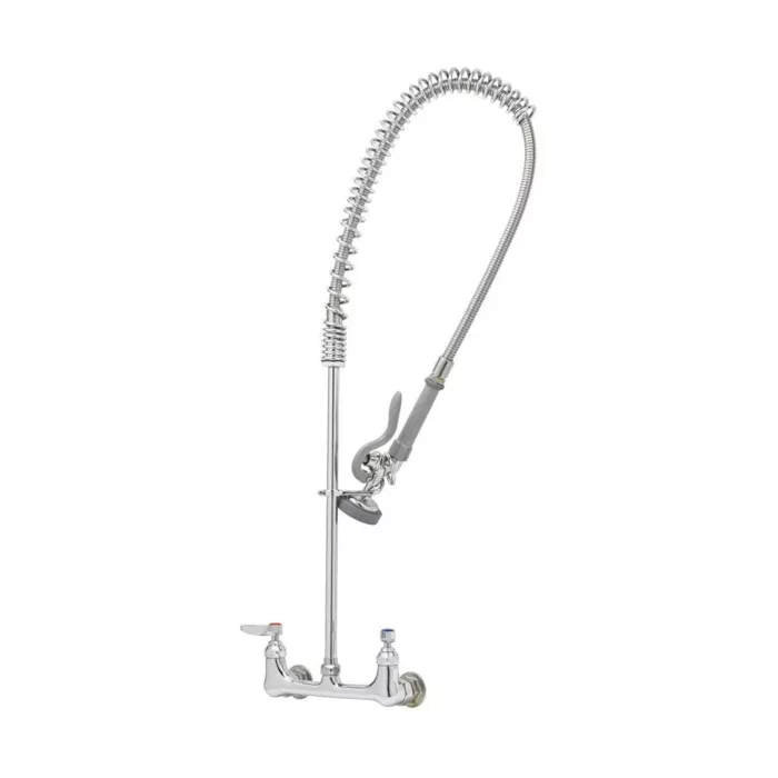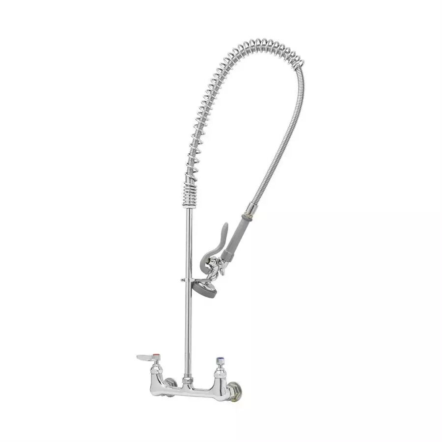 8" wall mount mixing faucet with polished chrome plated brass body, 18" riser, 44" flexible stainless steel hose with heat resistant handle, 1.42 GPM spray valve, compression cartridges with spring checks, lever handles, 1/2" NPT female inlets, spray valve holder, and overhead spring. Certified to ASME A112.18.1/CSA B125.1, NSF 61-Section 9 and NSF 372. EPAct 2005 compliant.