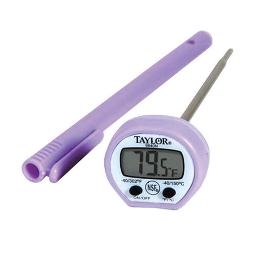 Purple allergen safety colour reduces the risk of cross-contamination. Easy-to-read 0.3" LCD readout. Temperature range -40°F to 302°F and -40°C to 150°C. On/off button to prolong battery life. One second updates. Stainless steel 5" stem. Storage sleeve with clip. 1.5 volt battery included. NSF listed.