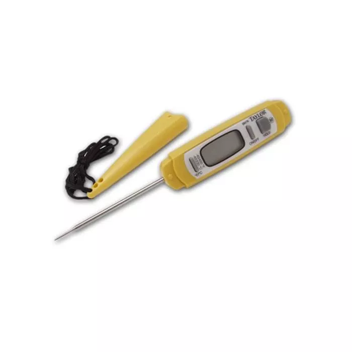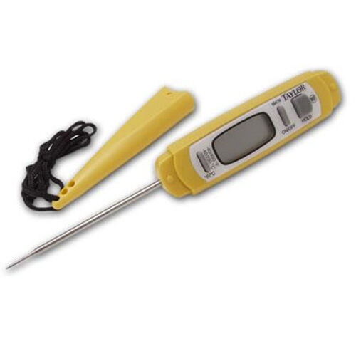 Pen-stye digital thermometer. Temperature range -40°F to 450°F or -40°C to 230°C. 1.5mm FDA recommended probe diameter. On/Off switch and auto shut off to conserve battery life. Hold feature for easy reading. One-second updates. 3" stainless steel stem. Anti-microbial plastic storage case inhibits growth of pathogens. Waterproof. 1.5 volt battery included. NSF listed.