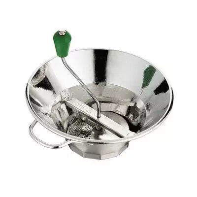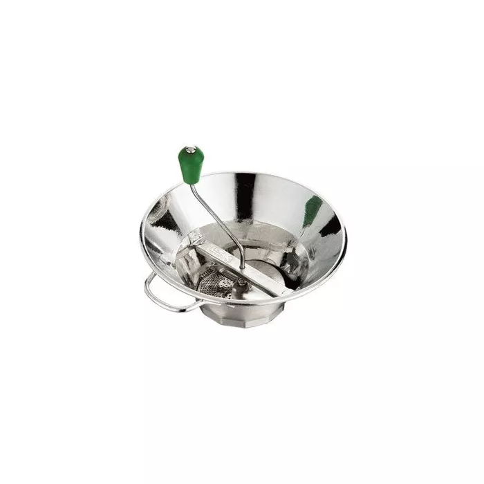 Purees and mills tomatoes, apples, carrots, potatoes and more. Strains out seeds and skins. Includes 3 grids: Small holes for fruit sauces and tomato juice (1.5 mm). Medium holes for purees and soups (2.5 mm). Large holes for stringy vegetables, root crops, cooked lettuce, spinach, leeks, etc. (4.0 mm). Flow rate per minute: 2.2 to 3.5 lbs. Number of servings: 10 to 20. Perforated height: 2". Usable pot: over 7".