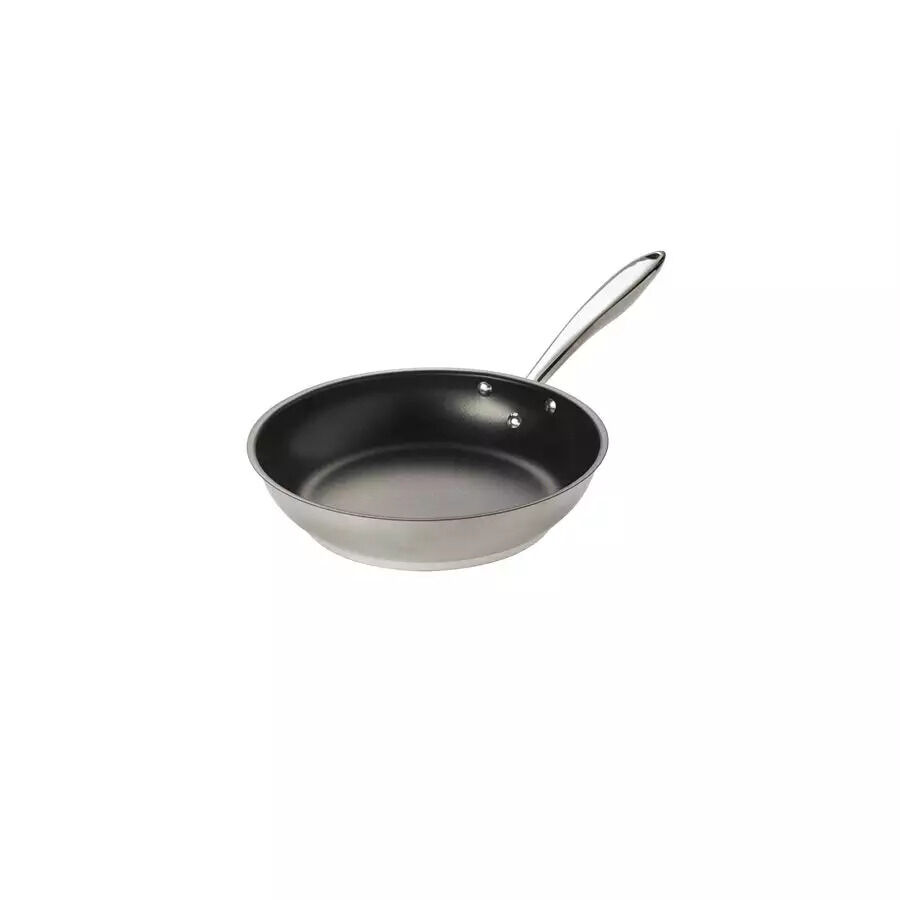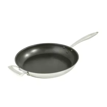 6 mm (0.25”) aluminum sandwich base for fast even heat transfer. Stay cool handle resists heating. 12" Diameter.