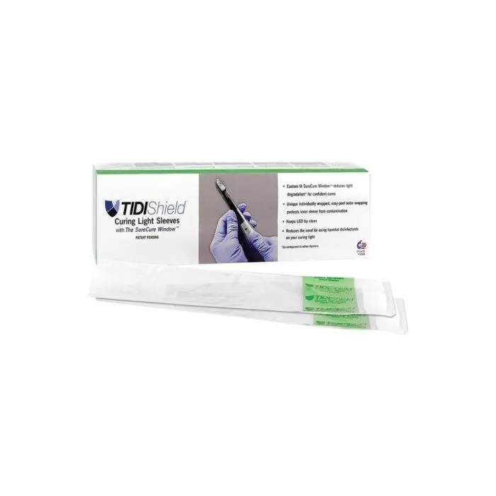 The TIDIShield LED Curing Light Sleeves with the SureCure Window provide a customizable fit over curing lights to help reduce the risk of contamination and are designed with soft, rounded edges for greater patient comfort