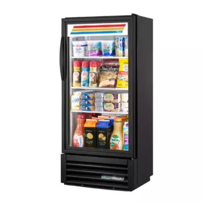 True's GDM-10SSL Merchandising Super Slim Line Refrigerator with 1 Glass Door - Black uses the highest quality materials and oversized refrigeration systems providing the user with colder product temperatures, and lower utility costs in an attractive merchandiser that brilliantly displays frozen food and ice cream.