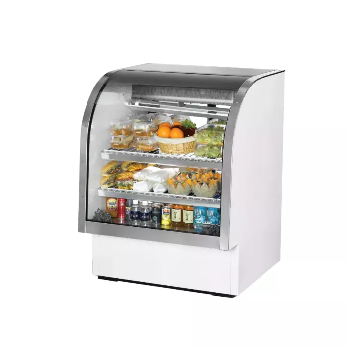 True TCGG-36 Refrigerated Deli Display Case with Curved Glass, White Exterior combines efficient, high-volume merchandising with exceptional refrigeration, all showcased through an elegant curved glass front. This design ensures a sophisticated presentation of deli products, while the gravity coil refrigeration system guarantees the freshest display of meats, cheeses, and other deli items, making it an essential addition to any premium food service environment.