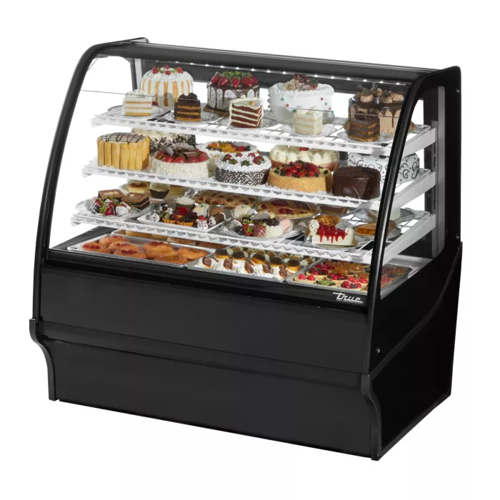True’s TDM-R-48-GE/GE-B-W Refrigerated Bakery Display Case Merchandiser with Curved Glass combines efficient, high-volume merchandising with exceptional refrigeration performance, all wrapped in an elegant curved glass front for a sophisticated presentation of high-end deli items, desserts, and pastries. Designed to complement our TDMDC "dry case" display merchandiser, this unit adds an attractive and functional touch to your display setup. Please note that if units are banked together, a 1/2" gap will remain between them due to the side panel design.