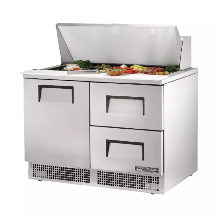 True's TFP-48-18M-D-2 Sandwich / Salad 18 Pan Refrigerated Prep Table Megatop, 2 Drawers & 1 Door uses the highest quality materials and oversized refrigeration systems providing the user with colder product temperatures, lower utility costs, exceptional food safety and the best value in today’s food service marketplace.