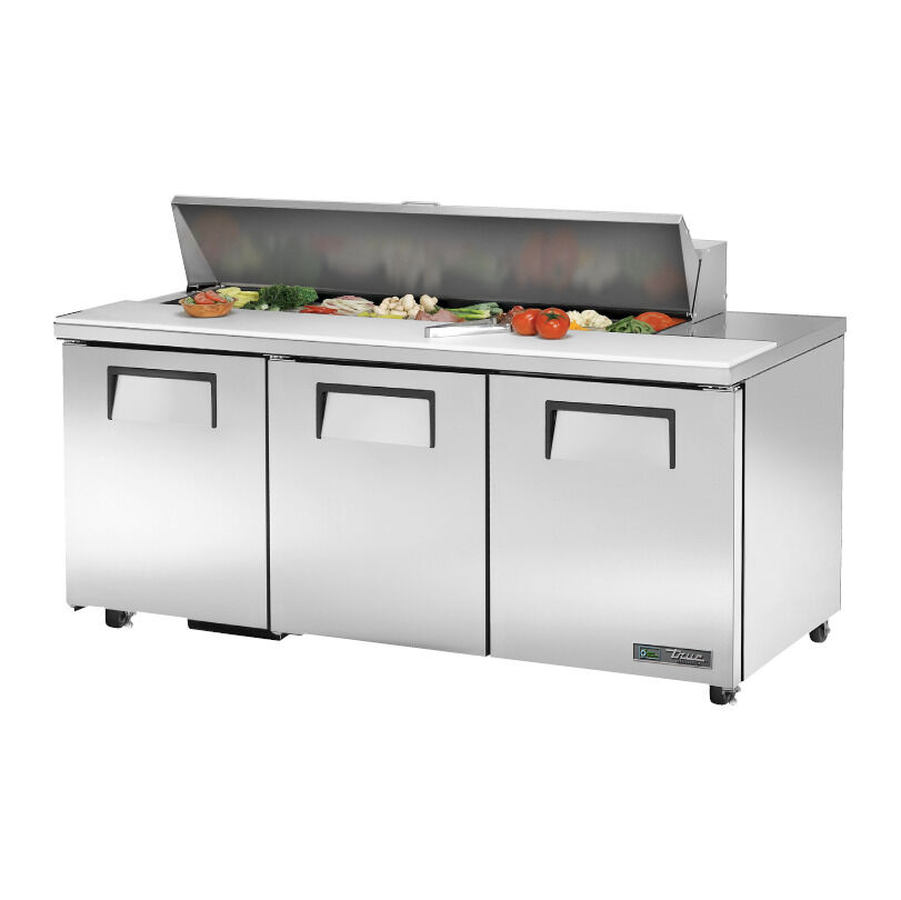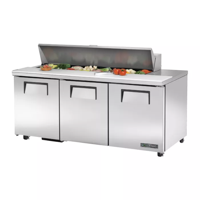 True TSSU-72-16 Sandwich / Salad 16 Pan Refrigerated Prep Table, 3 Doors uses the highest quality materials and oversized refrigeration systems providing the user with colder product temperatures, lower utility costs, exceptional food safety and the best value in today’s food service marketplace.