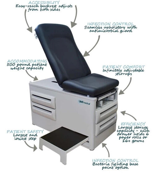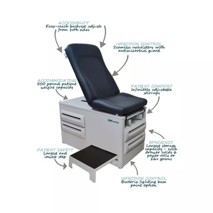 Removable UMF Ultra Comfort Seamless Top 12 upholstery and accent color options Articulating back section with gas spring assist One touch, Easy-glide comfort stirrups Slide out leg section with removable upholstered leg rest Removable plastic drip pan (9†x 9†/ 22.9cm x 22.9cm) Pull-out all steel non slip step (7†/ 17.8cm high) Paper roll holder Recessed paper roll storage area Two front storage drawers on full extension roller bearing drawer glides Two side storage drawers on full extension roller bearing drawer glides 500 pound (226.8kg) patient weight capacity Leveling glides 5 year limited warranty.