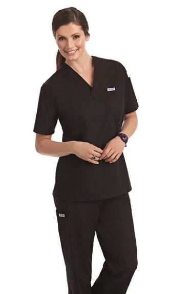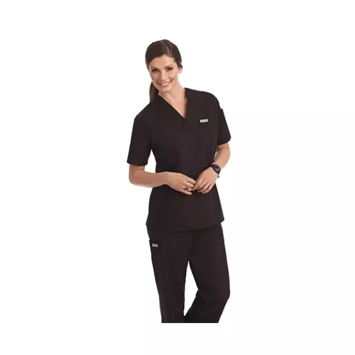 A classic v-neck scrub top with one chest pocket and one shoulder pen pocket and a simple five pocket drawstring pant. This set is ideal for school programs.