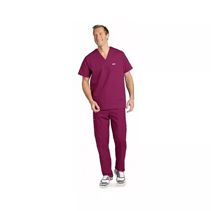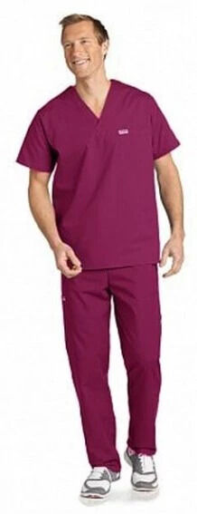 A classic v-neck scrub top with one chest pocket and one shoulder pen pocket and a simple five pocket drawstring pant. This set is ideal for school programs.