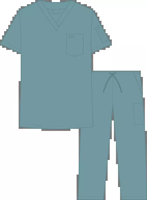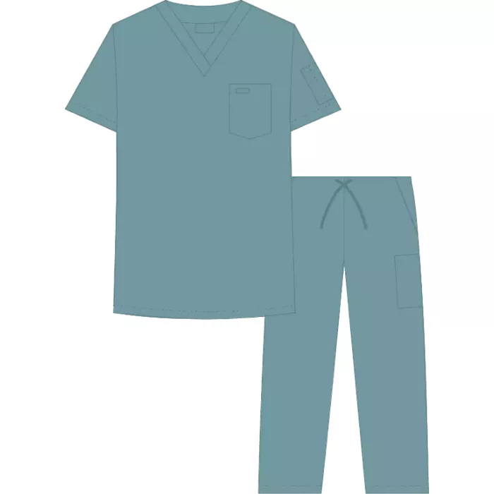 A classic v-neck scrub top with one chest pocket and one shoulder pen pocket and a simple five pocket drawstring pant. This set is ideal for school programs.