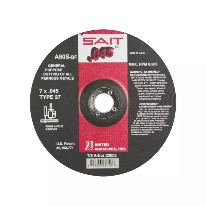 United Abrasives Inc. Meules à tronçonner à centre abaissé, 7" X 0,045" X 7/8", 8500 Tr/min max., 27 Type (22053)