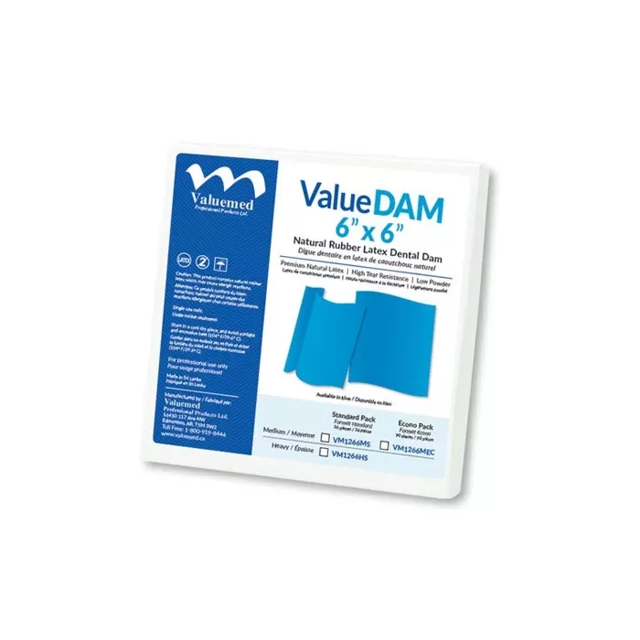 ValueDAM Premium Natural Rubber Latex dental dams have high tear resistance and low powder. These latex dams are in Blue in color and available in medium or heavy gauge. We are confident you will find our dams to be to the highest standards you expect for your use. If you find that they are not to your satisfaction we have a 100% money back guarantee on all our Valuemed Professional brand products.