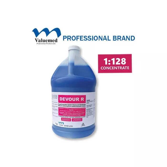 DEVOUR penetrates and degrades organic waste in evacuation lines with an effective combination of 5 enzymes. It maintains evacuation lines to keep them free-flowing and deodorized. The enzymatic action of DEVOUR works constantly between cleanings. - Biodegradable - Low Foaming - Constant Enzymatic Action Between Cleanings - 5 enzymes degrade fats, proteins, starch, sugars and cellulose - Amalgam separator safe - Economical concentrate formula DEVOUR is pH neutral, biodegradable and compatible with all materials ** PUMP NOT INCLUDED ** Valuemed Devour MSDS Valuemed Devour R MSDS - French