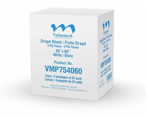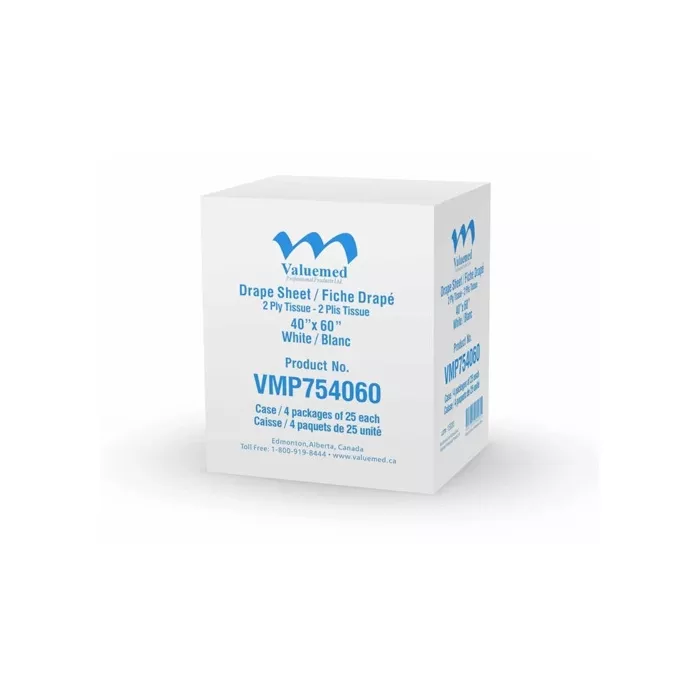Valuemed's exam drape sheets are made from two layers of tissue bonded together and embossed for comfort. Ideal for professional exams and procedures. Size: 40" x 60" Colour: White 100 sheets/case| Fabriqué au Canada | Oui |