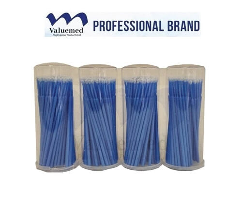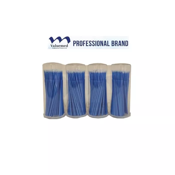 Valuemed's microbrush is perfect for all of your restorative solution holding needs. Bendable neck. Packaged in convenient tubes of 100 brushes. Blue colour, regular size. 4 tubes x 100 brushes (400 microbrushes)/packageVue d’ensemble