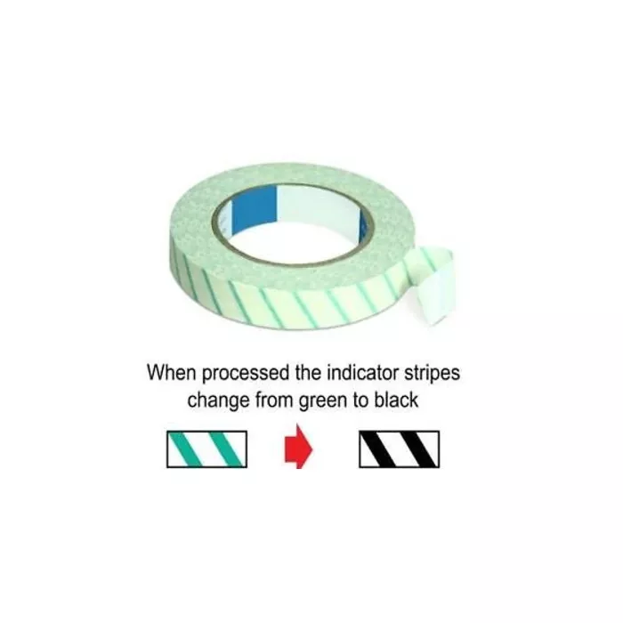 The Process Indicator Tape (Type 1) is designed to seal packs that are exposed to steam sterilization. The tape distinguishes between items processed and unprocessed in both gravity discharge and pre-vacuum steam sterilization processes. Designed for use in gravity sterilizers operating at 121°C for 30 minutes, 132°C for 3 minutes, 132°C for 10 minutes, 132°C for 15 minutes, 135°C for 3 minutes and 135°C for 10 minutes, or pre-vacuum sterilizers operating at 132°C for 3 minutes, 132°C for 4 minutes, 134°C for 3 minutes, 134°C for 4 minutes and 135°C for 3 minutes Designed to use on disposable wraps. The tape requires pressure upon application in order to provide proper contact, assuring that the tape will stay in place throughout the steam autoclave process. After use, the tape removes easily Made of a saturated crepe paper printed with non lead based ink, the green indicator lines turn dark black once exposed to the steam process. It is coated with a synthetic, solvent-free adhesive This product is not made with natural rubber latex Lead is not used in the manufacturing of the ink of indicator lines Each roll individually wrapped Meets ISO 11140-1:2014 requirement