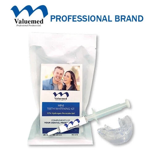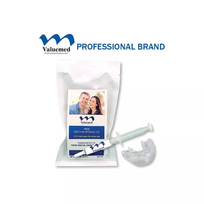 Now your patients can take a confident smile home with them! With the ValueMini Teeth Whitening Kit, patients can achieve a whiter smile from the comfort of home. This kit is a perfect way to reward patients or as an incentive to draw new clients. The 12% hydrogen peroxide guarantees results with less exposure than alternative products on the market. Imprinting is available; simply email us your logo and we'll take care of the rest! Mini kit includes: 1 x 3ml syringe and 1 mouth tray 12% hydrogen peroxide Ingredients: Propylene Glycol, Glycerin, Water, Hydrogen Peroxide, Carbomer, Triethanolamine, Potassium Nitrate, Flavor Instructions for use. 1) Brush and floss your teeth before each application. 2) Each syringe contains 3ml of premium gel which represents 3 tray applications. Remove cap from syringe. Apply a thin layer of gel (small bead) on the front-facing, inside part of the tray, extending from one side to the other.The objective is to have the gel coat the outer side of your teeth. Generally 0.5ml of gel is required for your uppers. 3) The tray is designed to whiten both your upper and lower teeth simultaneously. Therefore, flip the mouth tray and repeat step 2 for your lowers. 4) Place the cap back onto the syringe. This protects the gel from exposure and maintains shelf life. 5) Once the gel has been applied, simply insert the mouth tray and press firmly against the front of your teeth to ensure the gel has been spread and completely coats your teeth. Allow any excess gel to escape naturally and remove from your gums using a toothbrush or tissue. 6) Wear your tray once or twice each day for 20 minutes per application or as recommended by your dentist. These wear times are only suggested and approximate. Depending on your comfort, available time frame and individual sensitivity issues, the wear time can be decreased and the frequency can be lengthened to suggested maximums. 7) Upon completion of each application, remove your tray and rinse it with water. Rinse or brush your teeth to remove any excess whitening gel. 8) Continue using this system uninterrupted each day until all of your applications have been completed or the desired results are achieved. Other considerations: - Wait at least 1 hour between applications - Store syringes in a cool, dry place. Refrigerate if possible. - Avoid citrus fruits and juices until your applications have been completed, since they may cause sensitivity.