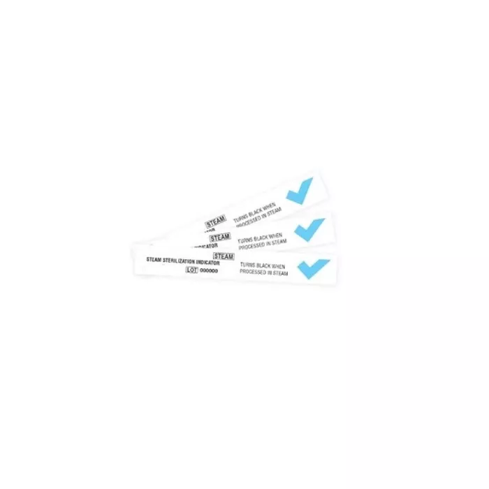 Steam Indicator Strips Change Color When Sterilized Shows a distinctive blue to black color change that is not reversible. Indicated for use in gravity and vacuum cycles.Vue d’ensemble