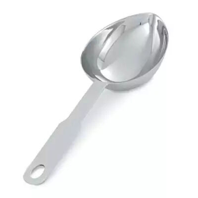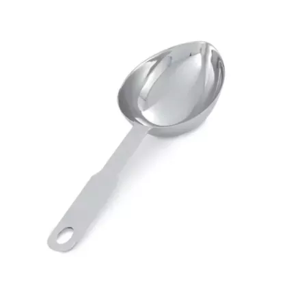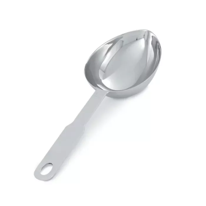 The tapered oval bowl allows for easy pouring and prevents messes, while the long handle offers excellent mixing leverage and a comfortable grip. The capacity is stamped on the handle for quick identification, and the hanging hole at the end provides a convenient storage solution. Ideal for both wet or dry ingredients, this measuring scoop is a versatile addition to any kitchen.